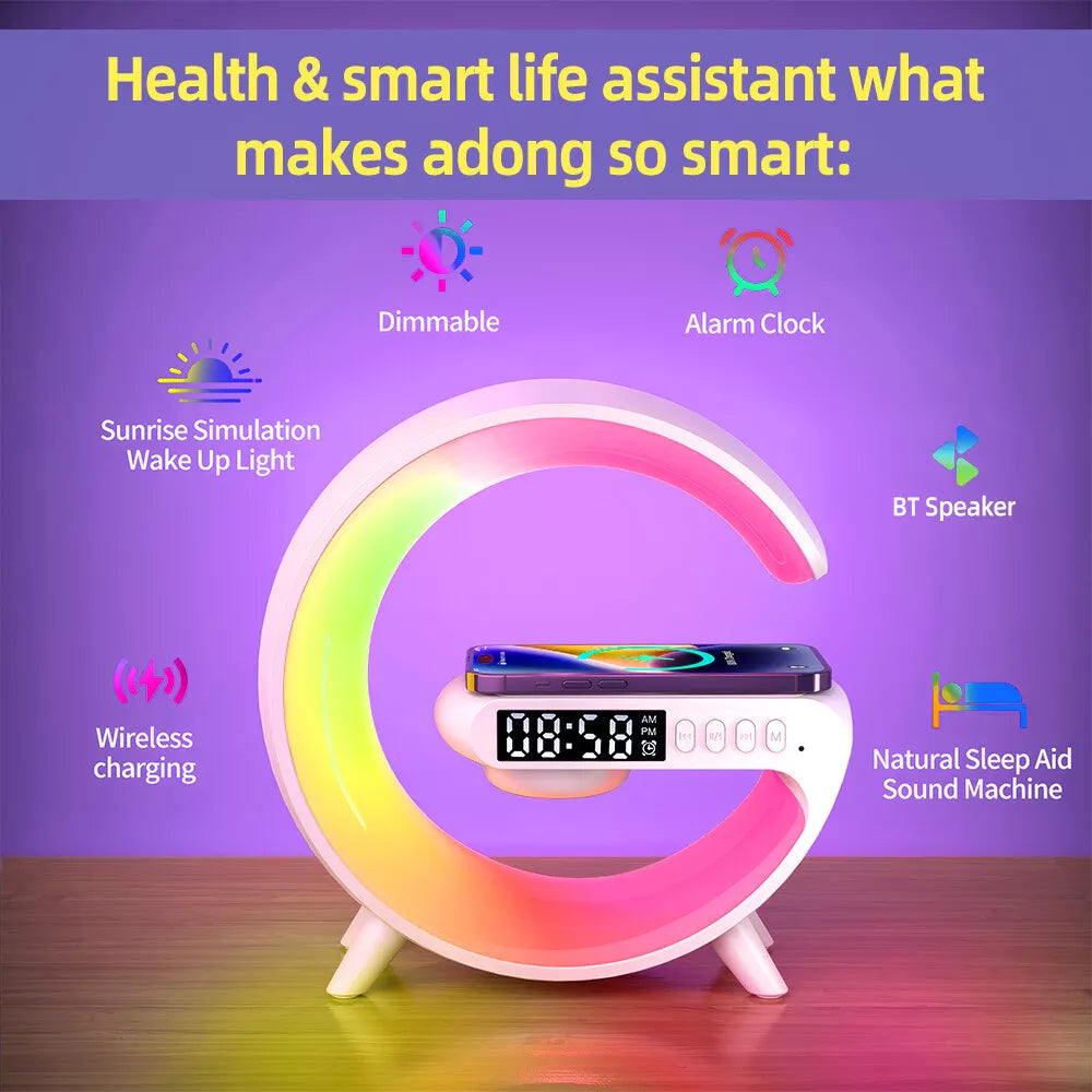 Változtasd otthonodat a modern kényelem oázisává! Ez az intelligens 3 az 1-ben RGB lámpa egyesíti az atmoszférikus világítást, a gyors vezeték nélküli töltést és a nagy teljesítményű Bluetooth hangszórót egyetlen stílusos eszközben – a dizájn és a technológia tökéletes harmóniájáért.